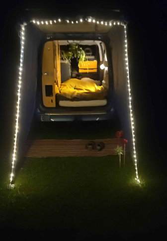 Wat een genot. Afgelopen weekend heb ik mijn paleis op wielen mogen uitproberen. De eerste nacht had ik alles uit de kast gehaald. Hefdak omhoog, aanleunwoning eraan, Auping matras erin, keukentje erbij. Wat een ruimte en wat een euforie.