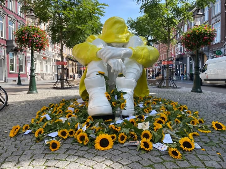 Ik was vanmiddag op en wel heel indrukwekkende bijeenkomst in Maastricht. Er stond een wel heel krachtig kunstwerk van Saskia Stolz met de titel “Stille Strijder”. Zij vertelde over de lange weg naar het uiteindelijke kunstwerk. Een zee van zonnebloemen lagen om dit imposante kunstwerk heen. Dany van Velthoven zong twee prachtige nummers. Iemand las gedichten van mensen die iemand verloren hadden.